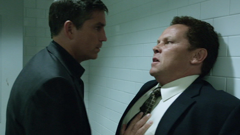 Reese's friend in the department, of course, is Fusco. Hi Fusco! Reese grabs him out of a hallway and into a men's room, pressing him up against a wall with one spread-open hand and I can't possibly tell you what I'm thinking right now. No, that is a gun on Fusco's belt, he's not at all happy to see Reese. He wants to know how Reese got in there, which is a reasonable question considering that's deep into the precinct where civilians should fear to tread. Reese fears nothing, first of all, and second of all he's got Stills's badge! Also he does kind of walk like the authority that comes with law and guns, head pointed straight ahead with eyes glancing rapidly at regular intervals to scan his surroundings, posture good but loose in case he needs to react quickly, springy stride that isn't hurried nor lagging. He follows that up real quick with reminding Fusco of the hold he has on him, thanks, Reese. Real friendly of you. Pragmatic, at this stage of the game, but even so. He needs a file from Fusco, and Fusco needs Reese to keep him out of jail before other inmates are doing things to him that involve walls. The other cops think he's dirty, don't you know. I have to agree with Reese, that's because he is dirty, and has been for a while. I doubt this is anything new or sudden, he's probably been under suspicion for at least a short time before Reese blasted into his life. And Reese is not concerned with Fusco's 'predicament,' and that whole sentence right there is an interesting piece of dialogue that reeks of someone who is well educated either at schools or of his own accord via reading everything he can get his hands on. I don't know if we've noted that before, but it stands out for the context. People who threaten cops with blackmail over a murdered cop don't usually use words like 'predicament' or phrases like 'not my doing or my concern.' Anyway. Reese the well-read gives Fusco the details and underscores his demand for the file and the Machine will now whisk us away via footage of major thoroughfares to a scene of archived video watching!
